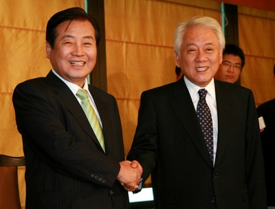 ▲ 중도개혁통합신당 김한길 대표와 민주당 박상천 대표가 3일 여의도 한 식당에서 합당 협상 막판조율을 위해 만나 악수하고 있다. ⓒ연합뉴스