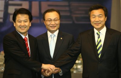 ▲ 정동영, 이해찬, 손학규 후보가 9일 KBS토론회 직전 손을 맞잡고 있다. ⓒ뉴시스