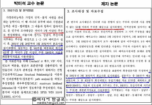 또 두 논문은 연구 목적을 밝히는 도입부, 활용한 설문조사 자료 등도 같고 조사기간도 "2001년 2월 28일부터 3월 20일까지"로 같다. 또 연구를 위해 만든 "질문지는 총 500부를 배부해 총 421부가 회수된 것"도 같다.