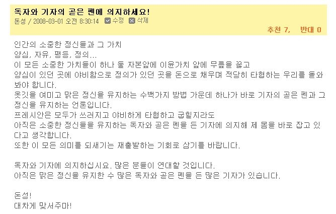 대부분의 독자들은 "프레시안, 흔들리지 말아라"는 매운 격려를 많이 주셨습니다. 독자 '돈성' 님께서 올려주신 댓글입니다.