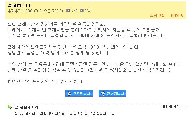 독자 '시민'께서도 "삼성이 공격할수록 프레시안은 더 뜨게되고 삼성만 더 후안무치한 존재가 됩니다. 회사 이름을 높여주는 삼성에게 오히려 고마워(?) 해야겠지요"라고 비슷한 의견을 내주셨네요.