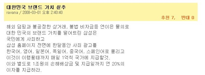 한편 댓글 중에는 삼성전자가 제기한 어이없는 요구 사항을 풍자하는 댓글도 많았습니다. 독자 'ravana' 님께서는 삼성그룹이야 말로 대한민국의 브랜드 가치를 실추시킨 데 사과하라고 꼬집어주셨습니다.