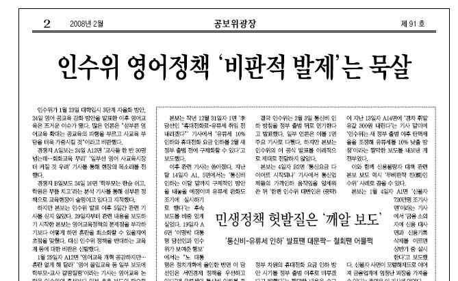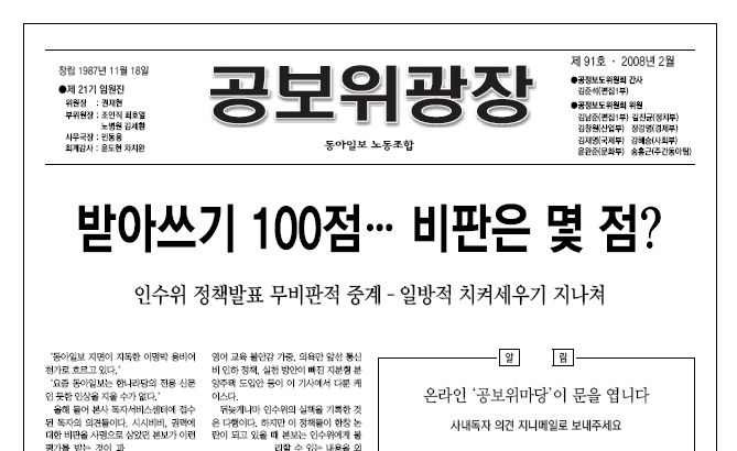 A3 용지 4쪽 분량의 <공보위광장>은 지면 1면 "받아쓰기 100점…비판은 몇 점?", 2면 "인수위 영어정책 '비판적 발제'는 묵살", 3면 "그때 그때 달랐던 '대선중립 잣대'", 4면 "독자들 '특정 후보 편드나' 따가운 눈총" 등의 기사로 자사의 보도를 비판했다.