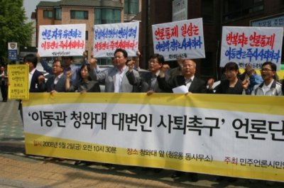 민주언론시민연합, 언론개혁시민연대, 전국언론노조 등은 2일 청와대 앞에서 기자회견을 열고 "이동관 씨의 해명은 이명박 정부의 도덕 불감증을 보여줄 뿐"이라며 이 대변인의 사퇴를 촉구했다.