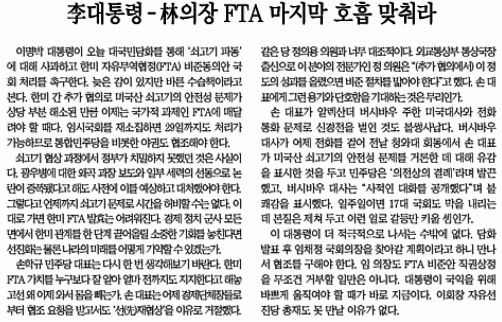 이 신문은 이날 '이 대통령-임 의장 FTA 마지막 호흡 맞춰라'는 사설에서 "한미 간 추가 협의로 미국산 쇠고기 안전성 문제가 상당 부분 해소된 만큼 이제는 국가적 과제인 FTA에 매달려야 할 때"라며 야당의 협조를 촉구하면서 "손학규 민주당 대표가 버시바우 대사와 전화 통화 문제로 신경전을 벌인 것도 볼썽 사납다"고 비판했다.