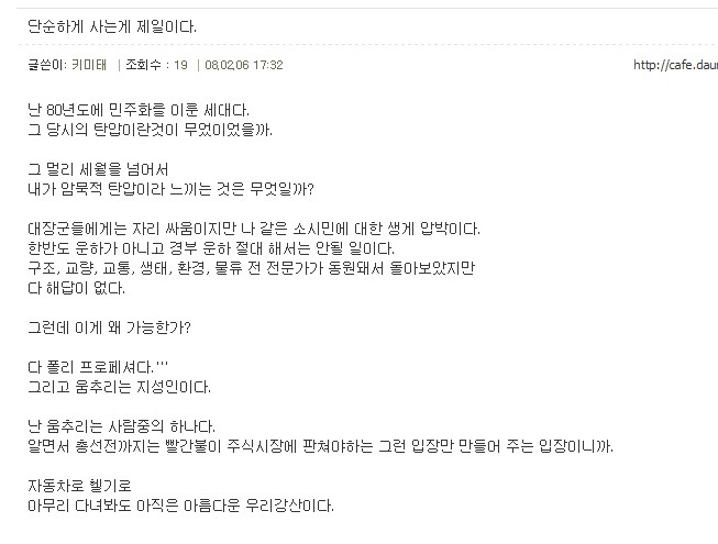 김이태 박사의 여동생은 24일 포털사이트 다음의 커뮤니티 '김이태 박사님을 지키기 위한 카페'에 "대운하 때문에 힘들어 했던 김 박사의 글"이라며 짧은 글을 올렸다. 지난 2월 6일 김이태 박사가 가족들과 비공개로 사용하는 가족 커뮤니티에 올린 글이라고 한다.