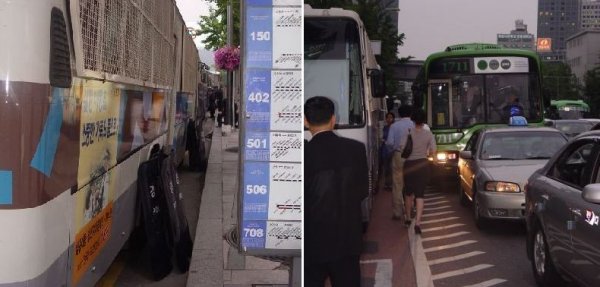 ▲ 광화문 일대에 전경버스가 줄지어 서있다. 전경버스가 버스정류장의 대부분을 차지해버려 시민들은 2차선에서 버스를 타야했다. 한 버스기사는 "교통체증은 전경버스가 다 일으킨다"고 불만을 터뜨렸다. ⓒ프레시안
