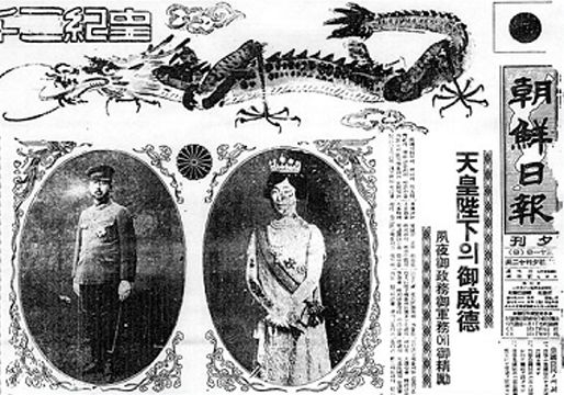 일제시대 <조선일보>의 제호 위에 일장기가 그려져 있는 것이나 1936년 1월 1일 신년사로 일본 천황 부부의 사진을 크게 그려두고 "우리는 대일본제국의 신민으로서 천황폐하께 충성을 다하겠습니다"라고 선언한 지면도 눈에 띈다.