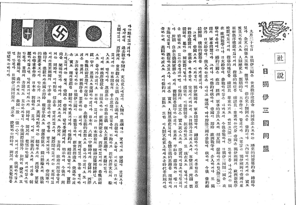 또 1938년 1월 1일 보도한 중일전쟁 참고도에서는 동해를 '일본해'로 표기하는가 하면 <조선일보> 자매 월간지 <조광>의 1940년 9월 24일 사설에서는 일장기와 나치 독일 하켄크로이츠 깃발, 파시스트 이탈리아의 국기를 걸고 이들 간의 군국주의 삼국동맹을 "인류 역사상 획기적 대사건"이라고 극찬하기도 했다.
