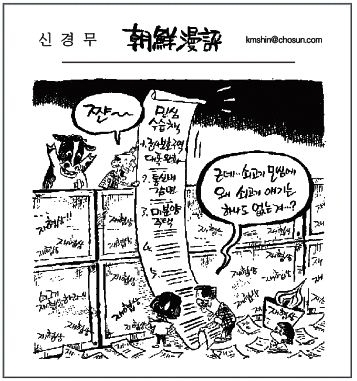 또 이날 '신경무 만평'에는 이명박 대통령이 미국산 소와 함께 컨테이너 뒤에서 '군사 보호구역 대폭 완화, 통신비 감면, 미분양 주택' 등이 적힌 '민심수습책'을 '짠'하고 내보이고 '재협상' 촛불을 들고 이를 읽는 시민들은 "근데 쇠고기 민심에 왜 쇠고기 이야기는 하나도 없는겨"라고 반응하는 내용이 실렸다.
