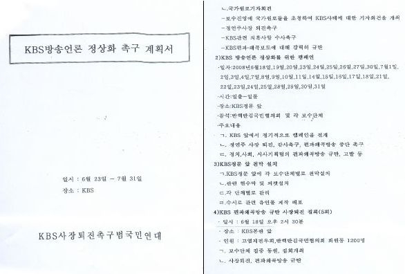 이 문건은 6월 23일부터 7월 31일까지 총 32회에 걸쳐 매일 일출~일몰까지 KBS정문 앞에서 "KBS 방송언론 정상화를 위한 캠페인"을 열어 "정치, 사회, 시사기획팀의 편파왜곡방송을 규탄, 고발하겠다"고 밝히고 있다.