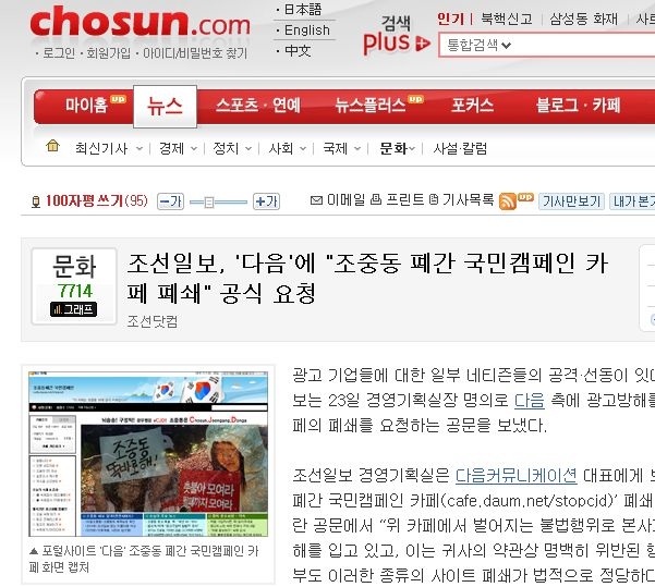 조선일보는 26일 저녁 자신의 홈페이지 '조선닷컴'에 기사를 올려 "기업들에 대한 일부 네티즌들의 공격·선동이 잇따르자 조선일보는 23일 경영기획실장 명의로 다음 측에 광고방해를 주도하는 카페의 폐쇄를 요청하는 공문을 보냈다"고 밝혔다.