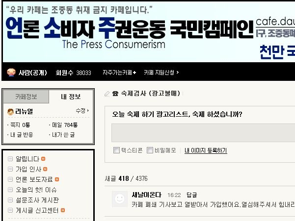 이 카페에 새로 가입한 누리꾼들은 "조선의 카페 폐쇄요청에 화나서 가입했다", "조선일보의 카페 홍보 기사를 보고 왔다", "조선일보에 기사를 가장한 광고를 내는 것을 보니 돈이 많은 까페인가보다", "절대 굴복하지 않아야 한다"는 등의 글을 올리며 이 카페를 지지한다는 뜻을 밝히고 있다.