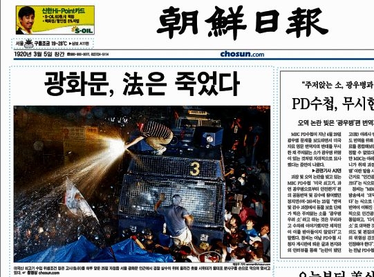 26일 <조선일보>에는 이러한 경찰의 불법진압 및 시위대 부상에 대한 기사는 한마디도 없었다. 대신 시위대의 시위가 '불법'이라는 데에만 초점을 맞춘 이 신문은 1면부터 "광화문, 법은 죽었다"는 1면 머릿기사와 함께 시위대가 경찰 살수차 위에 올라가 물대포 분사구를 손으로 막는 장면을 사진으로 내보냈다.