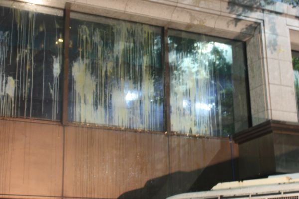 ▲시민들이 던진 계란으로 얼룩진 조선일보사 사옥. ⓒ프레시안