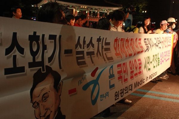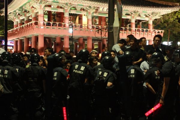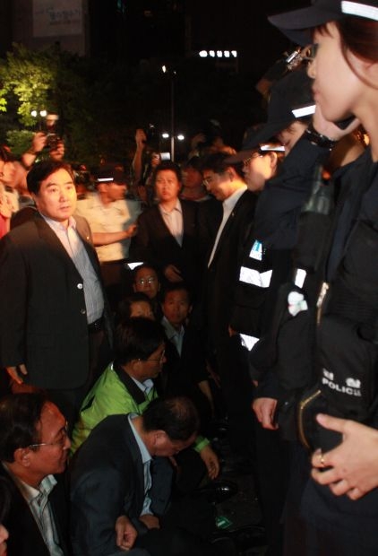 이에 앞서 우문수 종로경찰서장은 11시 40분 경 시위대 앞 쪽에 앉아있던 송영길, 강창일 의원에게 다가가 "차량 통행이 가능하도록 양쪽 2차선을 열어달라"고 요청하려다 시민들의 거센 항의를 받았다.