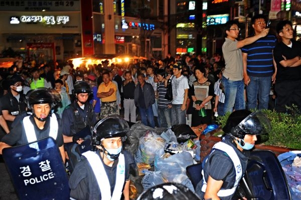 우 서장이 갑자기 정복 및 사복 경찰을 대동하고 갑자기 시위대 사이로 끼어들자 흥분한 시민들은 "어청수는 물러가라"를 외치며 몰려들었고 일부 시민은 우 서장에게 생수통에 든 물을 끼얹기도 했다.