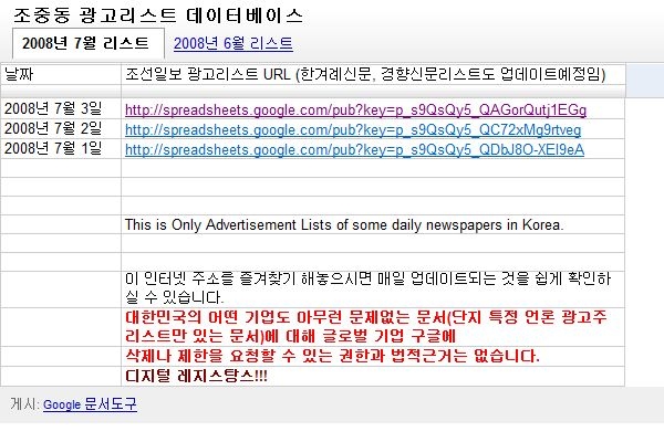 | "다음이 안 되면 구글로 간다" 한편, 누리꾼들은 구글 등 해외사이트에 '조·중·동 광고주 리스트'를 올리는 등 방통심의위의 결정을 피해 '숙제'하기 운동을 펼치고 있다. 한 누리꾼은 해외 사이트인 '구글'의 웹오피스에 스프레드시트 형태로 '조·중 ·동 광고주 리스트'를 올리고 매일 업데이트 하고 있다. 개인 문서를 '공개'로 올리는 형태다. 다른 누리꾼들은 이 곳의 웹 주소를 퍼뜨리며 다시 '숙제'를 독려하고 있다. 구글은 해외 사이트인데다 국내 포털사이트와 달리 회원 가입시 주민등록번호 등 신원정보를 기입해야 하는 시스템이 아니기 때문에 형사 처벌의 대상이 되기 어렵다는 판단이 깔려있다. 이와 관련 구글코리아 측은 "콘텐츠의 소유권은 게시자에 있으며 삭제 권한도 마찬가지"라는 입장을 밝혀왔으나 최근 한 언론사가 해당 리스트를 삭제해달라는 공문을 보내옴에 따라 미국 본사 법무팀과 대응 방안을 논의 중인 것으로 알려졌다.