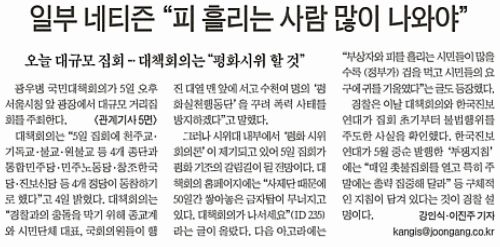 <중앙일보>는 5일 "일부 네티즌 '피 흘리는 사람 많이 나와야'"라는 기사를 냈다. 소제목으로는 "오늘 대규모 집회…대책회의는 '평화시위 할 것'"이라고 달았다. 제목이 보여주는 대로 이 기사는 대책회의의 '평화시위 방침'보다 대책회의 홈페이지나 다음 아고라에 올라온 '폭력 행사 주장'을 더 비중있게 다루면서 이날 있을 촛불 시위가 '폭력적 양상'으로 나타날 것을 '전망'하는 내용이다.