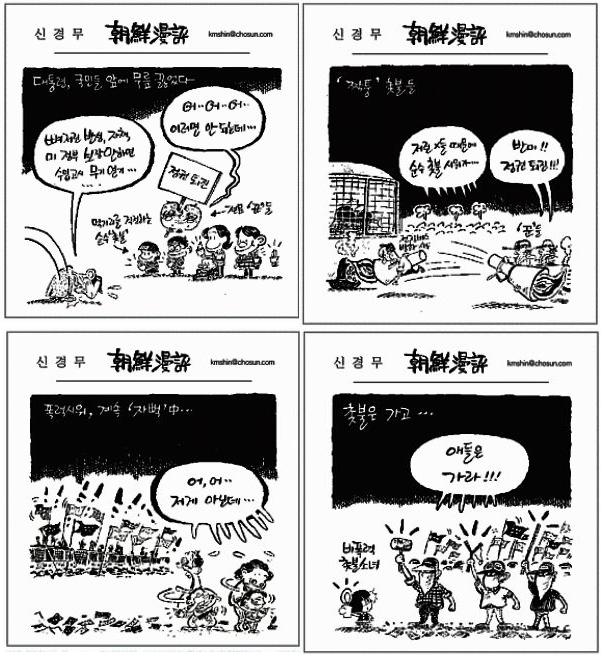 물론 이들 신문이 '광우병국민대책회의 등 전문시위꾼이 시위를 주도하고 시민들은 일탈하고 있다'는 식으로 몰아온 것은 어제 오늘의 일은 아니다. <조선일보>는 3일 "궁지 몰린 시위대, 종교계에 'SOS'" 기사에서 "대책회의가 종교계를 향해 손을 내민 것은 사면초가에 몰렸기 때문"이라며 "극단적인 폭력 양상을 보인 시위에 시민들이 갈수록 등을 돌렸기 때문"이라고 했다.