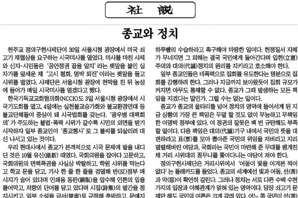 이 신문은 2일 '종교와 정치'라는 사설에서 사제단을 맹비난하면서 "일부 종교인들은 비폭력으로 집회를 유도한다는 명분으로 집회를 강행하려 한다"며 "그러나 지금까지 보아왔듯이 집회 규모가 커지면 아무도 통제할 수 없다. 종교가 그때 발생하는 모든 책임을 지겠다는 말인가. 그럴 수는 없는 일이다"라고 했다.