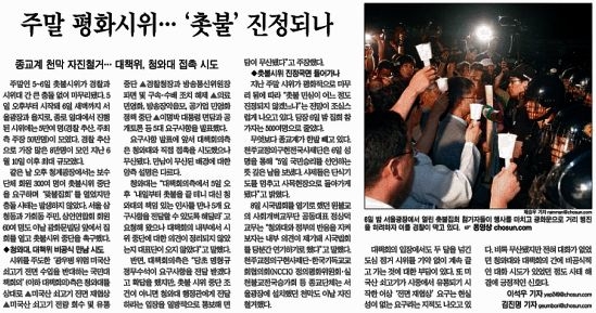 이 기사에서도 지난 주말의 촛불 시위를 '평화적이었다'는 사실에만 초점을 맞춰 간략히 전하면서 "지난 주말 시위가 평화적으로 마무리 됨에 따라 '촛불 민심이 어느정도 진정되지 않겠느냐'는 전망이 조심스럽게 나오고 있다"고 내다봤다. "당장 6일 밤 집회 참가자는 500명으로 줄었다", "무엇보다 종교계가 한발 빼고 있다"는 식이다.