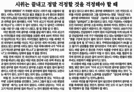 초기 토론과 자유발언으로 이어지던 촛불 시위가 점차 '구호' 중심으로 바뀐 것은 정부가 시민들의 촛불 시위를 인정하지 않고 강경진압과 내용없는 추가협상 등 '거짓말'로 대처하면서부터다. 정부에 대해선 '청와대가 불법시위 주도세력의 협상 파트너인가'라며 '대화 불가'를 종용하면서 시민들에게는 '대화가 없다'고 비난할 수 있는지, 과연 <동아일보>가 진정으로 바라는 '해결책'은 무엇인지 의문이다.