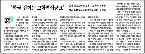 한편 <동아일보>는 주말 내내 평화시위를 지킨 촛불 시위대에는 '토론 문화가 없다'고 비판하고 이명박 정부에게는 '시민들과 대화해서는 안된다'고 비난하는 이율배반적인 기사와 사설을 냈다.