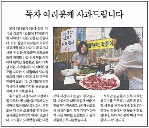 이 신문은 8일 2면 기사에서 "본지 7월 5일자 9면에 실린 '미국산 쇠고기 1인분에 1700원'이란 제목의 사진은 연출된 것"이라며 "사진 설명은 손님들이 미국산 쇠고기를 먹고 있다고 돼 있으나 사진 속 인물 중 오른쪽 옆모습은 현장 취재를 나간 경제부 기자이며 왼쪽은 동행했던 본지 대학생 인턴 기자"라고 밝혔다.