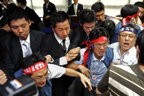 이날 주주총회가 열린 서울 남대문 YTN 본사 5층에서는 김재윤 사장이 용역 경비업체 직원 30명 가량의 호위 속에 주주총회를 진행하려고 시도하면서 노조원과 용역업체 직원 간 한바탕 몸싸움이 벌어졌다. 노조원은 "용역 빼라", "하수인 물러가라" 등을 외치며 몸싸움을 벌였고 용역업체 직원은 막말을 서슴지 않으며 노조원과 몸싸움을 벌였다.