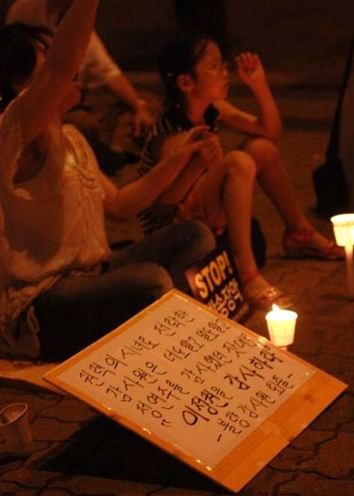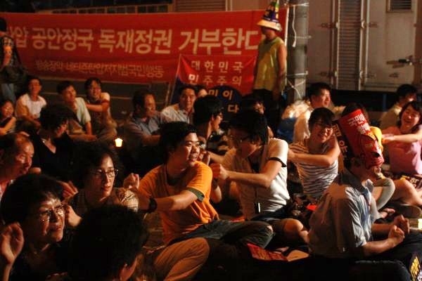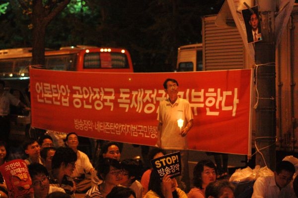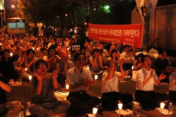 전날 경찰에 강제 연행됐다 이날 오후 풀려난 성유보 방송장악·네티즌장악저지 위원장은 "돌이켜보니 내가 시국사건으로 경찰에게 마지막으로 조사받은 때가 22년전인 1986년 11월 건대항쟁 때였다"며 "그간 그러한 과거로 돌아가지 않을 것이라는 믿음이랄까, 안일함에 안주해왔다는 후회감이 들었다"고 했다.