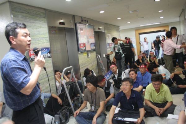 박승규 위원장은 "공권력을 막아내지 못한 노동조합의 무능함을 질책하는 목소리를 달게 듣겠다"며 "차기 낙하산 사장 선임을 막아내기 위해 오늘 이사회를 저지하겠다"고 밝혔다.