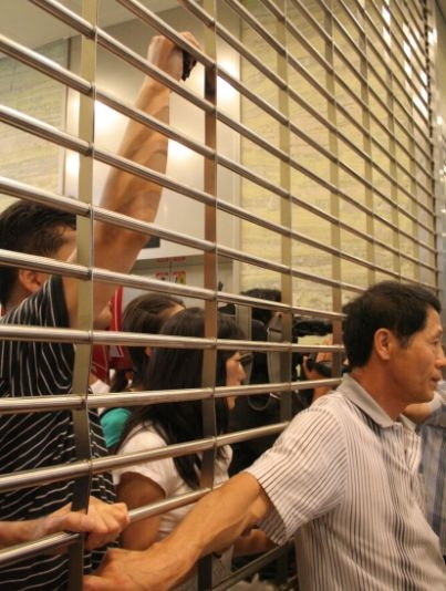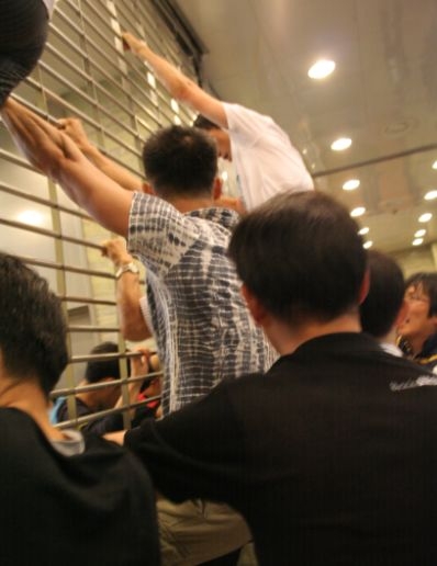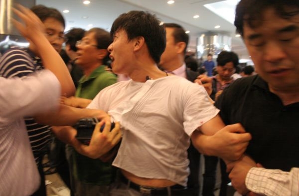 일부 사원들은 철문을 들어올리려 시도해보기도 했으나 청원경찰들의 저지로 이조차 여의치 않았다. 또 청원경찰은 몸싸움을 취재하는 기자를 폭행하고 취재를 방해하면서 "기자들은 다 죽어야 해"라는 식으로 폭언도 퍼부어 취재기자와 청원경찰 간 말싸움이 벌어지기도 했다.