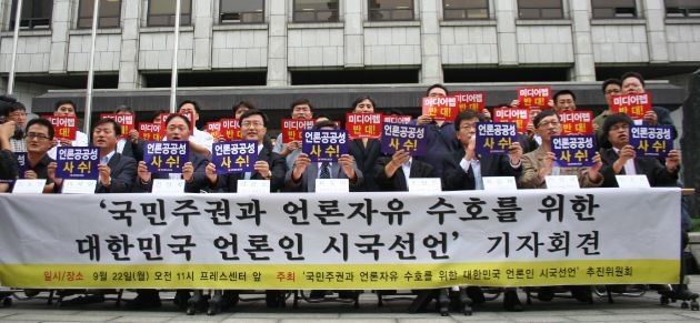 이명박 정부의 전방위적인 언론 장악에 맞서 언론인들이 직접 행동에 나서야 한다는 목소리가 커지고 있다. 22일 서울 광화문 프레스센터 앞에서는 언론 현업 단체가 주축이 되어 결성한 '국민주권과 언론자유 수호를 위한 대한 언론인 시국선언 추진위원회' 기자 회견이 열렸다. 이 자리에는 한국기자협회, PD협회, 방송기술인연합회, 전국언론노조 등 11개 언론현업 단체와 새언론포럼, 동아투위 등 전·현직 언론인들이 대거 참여했다.