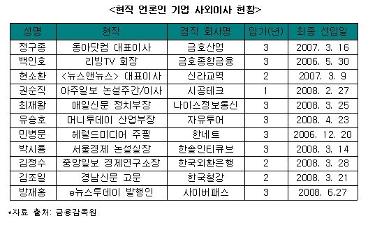 현직 언론인 사외이사를 직책별로 구분해 보면 대표이사·사장이 4명으로 가장 많았고 주필·논설위원이 3명, 정치부장·산업부장이 각 1명씩으로 나타났다. 특히 정구종 현 동아닷컴 대표이사는 2001년 3월부터 현재까지 금호산업의 사외이사를 맡고 있으며 민병문 헤럴드미디어 주필은 2002년 3월 중소기업은행 사외이사를 거쳐 현재 한네트 사외이사를 맡고 있어 '장수' 사외이사로 꼽혔다.