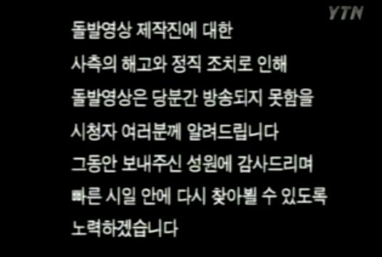 <돌발영상> 제작진은 8일 방송된 프로그램 끝에 공지문을 내 "'돌발영상' 제작진에 대한 사측의 해고와 정직 조치로 '돌발영상'이 당분간 방송되지 못한다"며 "빠른 시일 안에 다시 찾아뵐 수 있도록 노력하겠다"고 밝혔다.