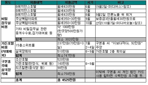 이 자료를 보면, 구본홍 사장은 지난 6월 이후 월 420만 원 가량의 B레지던스호텔과 월 350만 원 가량의 D주상복합아파트(종로구 견지동) 등을 비밀 집무실로 사용하면서 총 2020만 원을 사용했다. 기타 비밀 집무실 관련 중개 수수료, 집기 대여료 등을 합하면 약 3020만 원 가량이 되리라는 분석이다.