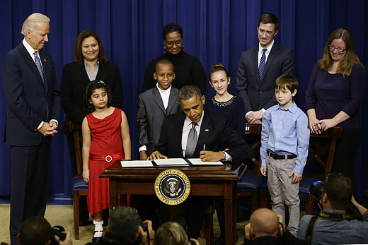 | ▲ 버락 오바마 미국 대통령이 16일(현지시간) 백악관에서 총기규제 행정명령에 서명하고 있다. ⓒAP=연합뉴스 |