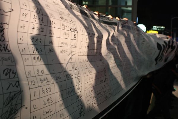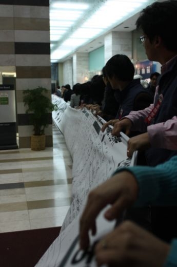 이날 대회에 참석한 전·현직 언론인은 서명부를 인쇄한 100m 현수막으로 YTN 사옥을 둘러쌌다. 말하자면 '부정풀이'를 위한 일종의 '탑돌이'인 셈. 이들은 현수막을 두루마리로 말아 언론인의 서명 용지와 함께 청와대에 전달할 예정이다.