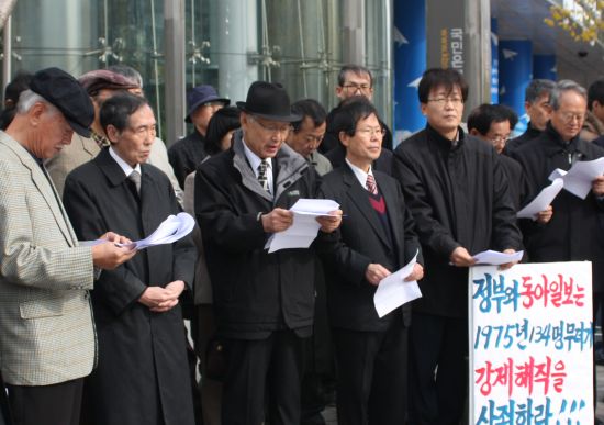 ▲ 동아투위 소속 해직 언론인들이 이명박 대통령과 동아일보 김재호 사장에게 보내는 편지를 낭독하고 있다. ⓒ프레시안