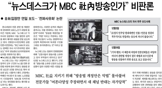 <조선일보>는 "'뉴스데스크가 MBC 사내 방송인가' 비판론"이라는 기사에서 "MBC는 파업까지 강행하면서 언론 관련법을 '정치 쟁점화'하려는 시도를 하고 있다"면서 "<뉴스데스크>는 자사의 입장에서 언론 관계 법안의 성격을 왜곡 해석한 내용을 연일 보도하고 있다. MBC는 '언론 관계법 개정=MBC 민영화=방송 장악'이라는 주장을 되풀이했다"고 비난했다.