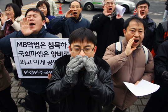 민주노총, 진보연대, 참여연대 등 400여개 시민단체로 구성된 민생민주국민회의는 5일 서울 여의도 KBS 본관 앞에서 기자회견을 열고 'MB악법'·언론법 개악 관련 KBS 보도 행태를 규탄하는 기자회견을 열었다.