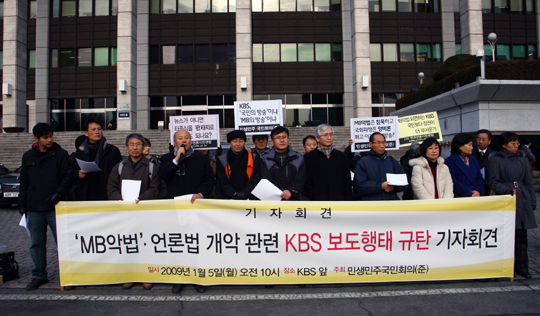 KBS는 국회에서 장기간 여야 대치를 불러온 이른바 'MB악법'에 대해서도 여야간의 물리적 충돌만 보도할 뿐 그 원인에 대해서는 거의 보도하지 않았다는 비판이다. 또 언론 관련법에 반대해 일어난 전국언론노조(위원장 최상재)의 파업 보도도 거의 하지 않고 '방송 차질'에만 초점을 맞췄다. 지난 31일 밤에는 보신각 타종행사를 중계하면서 'MB정부 퇴진'을 외치는 시민들을 의도적으로 배제해 '조작방송' 논란을 불러오기도 했다.
