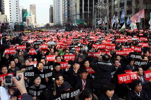 이날 국민대회에 참석해 무대에 오른 이들은 한 목소리로 이명박 대통령의 사과와 원세훈 국정원장 내정자, 김석기 경찰청장 내정자 등의 처벌과 즉각 사퇴 등을 촉구했다.