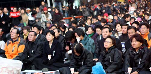 용산 철거민 참사에서 목숨을 잃은 고 윤용현 씨의 부인 유영숙 씨는 1일 서울 청계광장에서 열린 '폭력 살인 진압 규탄 및 'MB 악법' 저지 국민 대회'에서 무대에 올라 작심한 듯 원망스러운 속내를 토로했다. 격앙된 그의 목소리에 5000여 명이 모인 광장은 더욱 숙연해졌다.