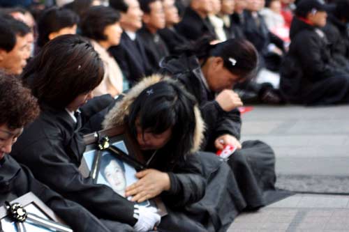 국민대회 내내 간간이 눈물을 흘리던 유족들은 가수 안치환 씨가 무대에 올라 1987년 6월 항쟁에서부터 불리워진 '마른 잎 다시 살아나'라는 노래를 부르자 들고 있던 영정을 안고 오열했다.