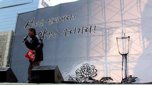 정광훈 한국진보연대 의장은 "인류사에 있을 수 없는 사태가 터졌다. 그런데 이명박 대통령은 전철연이 조종했는지 모른다는 소리나 한다"면서 "모를 수밖에 없다. 원흉은 바로 너다"라고 강조해 시민들의 열띤 호응을 얻었다.