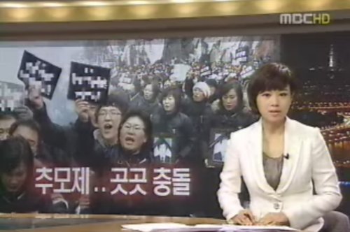 | ▲ 지난 7일자 MBC <뉴스데스크> 중 앵커 멘트 화면. 앵커 뒤에 걸린 화면에서 시민들이 들고 있는 손 팻말에 글씨가 지워져 있다. ⓒ프레시안 |