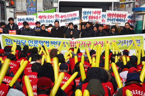 전국언론노조(위원장 최상재)는 20일 서울 여의도 한나라당사를 비롯한 부산, 제주, 충북 등 각 시·도 한나라당사 앞에서 '한나라당 언론악법 반대 및 합의 기구 구성 촉구' 기자 회견을 열어 한나라당을 규탄했다.