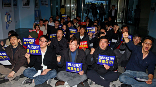 | ▲ CBS 사옥 1층에서 열린 CBS 노동조합 총파업 출정식에서 조합원들이 "한나라당은 해체하라" 구호를 외치고 있다. ⓒ언론노보 |